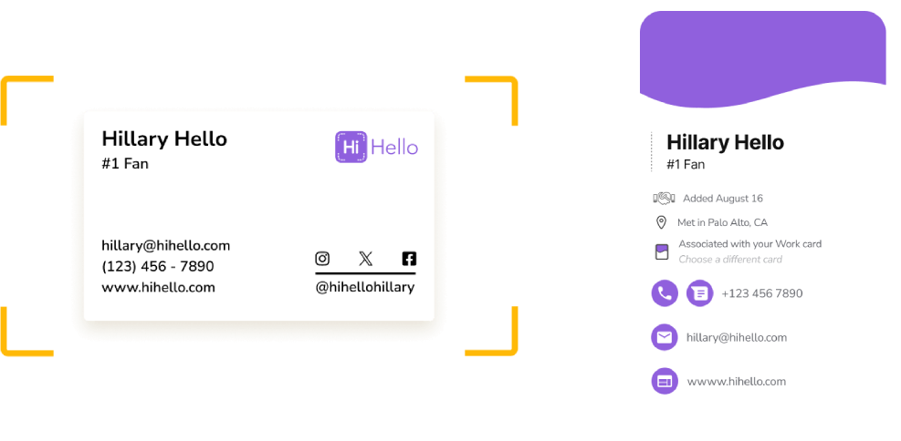 Create a great first impression with a digital business card that includes your brand’s most important information, like your contact details, social media, website links, and more. With advanced options for design, sharing, analytics, integrations, and more, HiHello can generate more opportunities and insights from your business interactions.